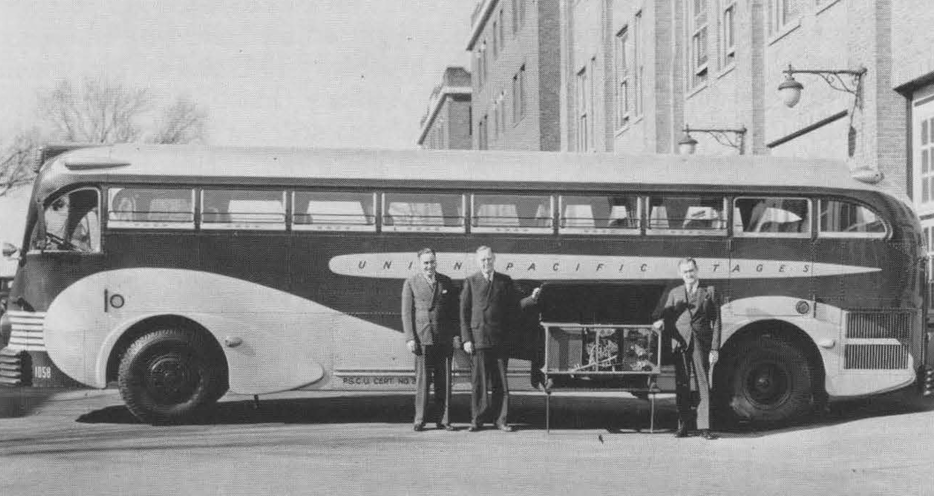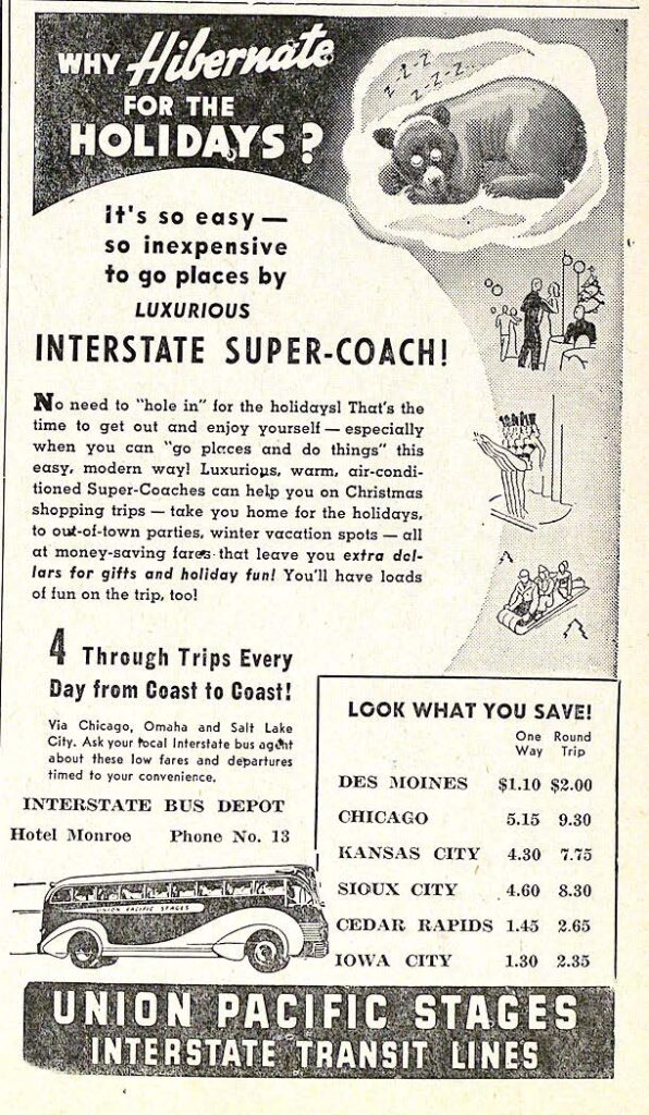 Many Grinnellians may recall that (before 1970) many people often travelled to and from Grinnell via the train, using the Union Depot train station that was located across from Central Park and the Monroe Hotel. Less well known is the fact that several bus lines also served Grinnell over the years, such as the Union Pacific’s “Stages” line, that the railroad giant had created in the 1920s to compete with Greyhound and other emerging bus lines.  This advertisement appeared on campus in November of 1939, touting their luxurious new “super” coaches that would whisk travelers to these midwestern destinations as well as dozens of other cities (by changing buses a their hubs in Chicago, Kansas City, and Omaha).  The picture below shows engineers proudly installing an air-conditioner into one of the new super-coaches that would service towns like Grinnell.