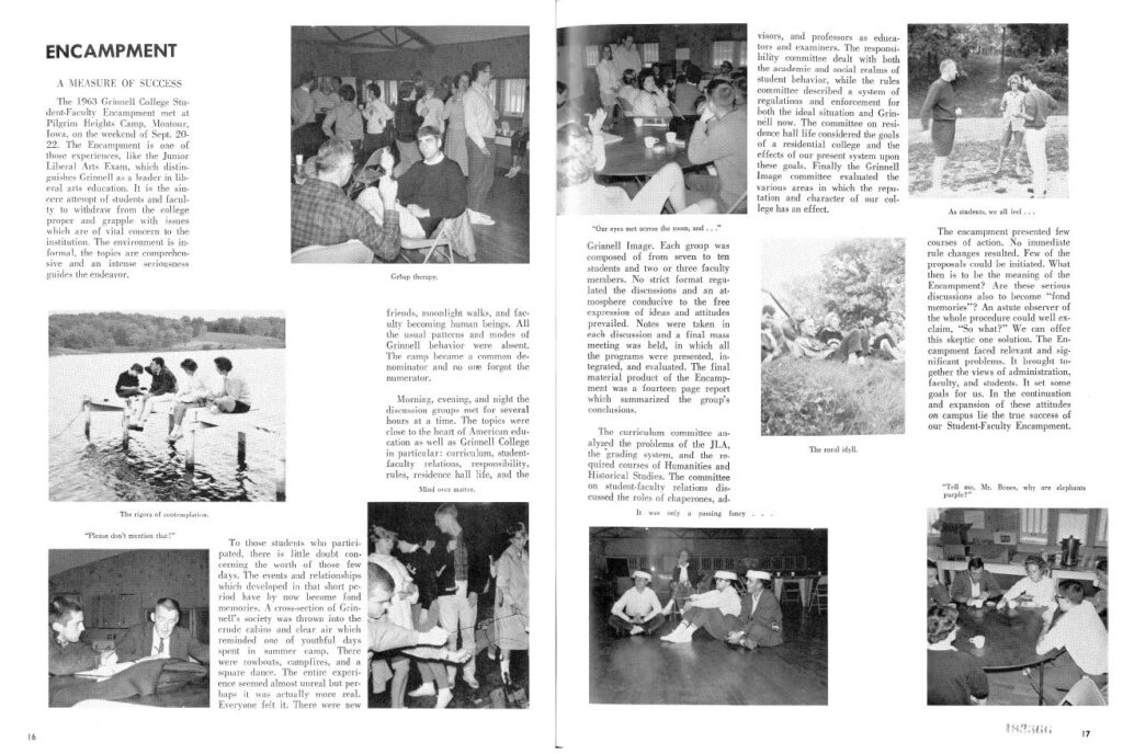 In 1960, the Student Government Association and President Howard Bowen agreed to hold a multi-day retreat, off-campus, that would bring together a select group of students, faculty, and administrators to discuss the “Purposes and Values of a Liberal Arts Education” at Grinnell. This retreat, or “Encampment,” as they called it, became a recurring tradition, in which about 100 members of the campus community would gather at some retreat site in October, each year, to spend a few days informally discussing broader issues of campus culture and curriculum as well as tackling concrete issues, needs, or policies (on a more practical level). The tradition of encampments was seen as one of the more distinctive aspects of campus life and shared governance at Grinnell.
