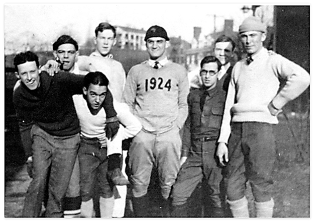 Grinnellians posing before the Thanksgiving match in 1924 (note: the player on the far right is Hap Moran, who went on to a successful career as a starter in the NFL for more than a decade)