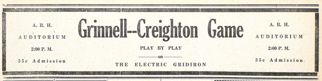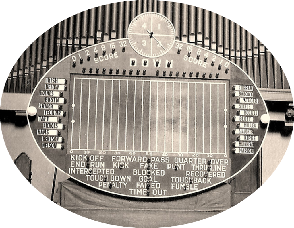 On Thanksgiving Day—100 years ago—many of the Grinnell students who remained on campus gathered in the auditorium of A.R.H to “watch” their football team play the last game of the season against their rival, Creighton, in Omaha. The college marching band assembled in the auditorium, along with Grinnell’s cheerleading squad, but all eyes were on the new “Grid-Graph” machine, which weighed nearly 1,000 pounds, and was designed to visualize remote football matches via instant telegraphy, electrical switches, and lights, so that fans could follow the action in real time, play-by-play (in an era before television coverage, and when even radio broadcasting of games was limited to a few nationally chosen matches). In the 1920s, Grid-Graph became all the rage in college sports, and Grinnell was excited to sign its own contract in 1924 to bring the marvels of modern technology (the “electric gridiron”) to campus.